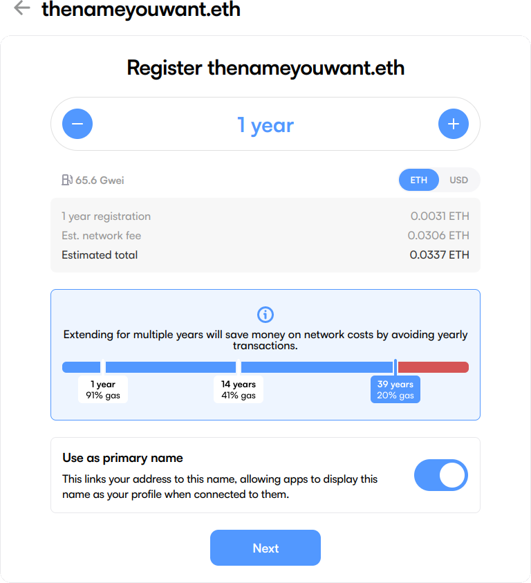 When looking up an ENS name the ENS Manager App will display a rough estimate of your registration cost: