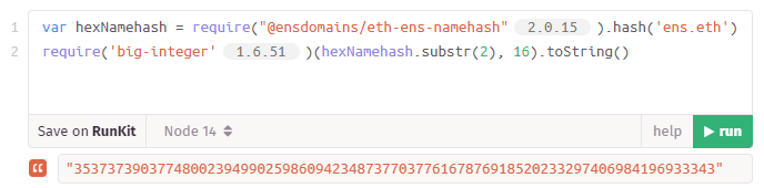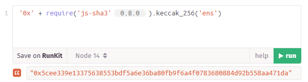 Enter the above code, and it'll spit out the namehash in hexadecimal format: