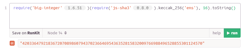 require('big-integer')(require('js-sha3').keccak_256('ens'), 16).toString()