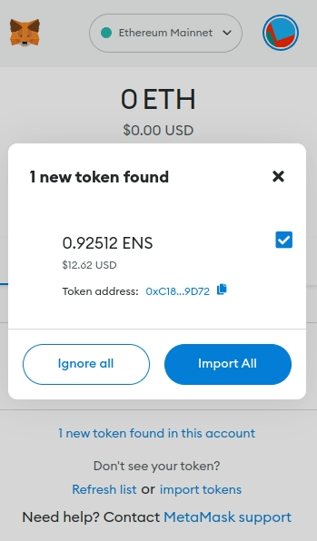 Now your ENS voting tokens and/or ENS domain tokens should be visible in your Metamask wallet.