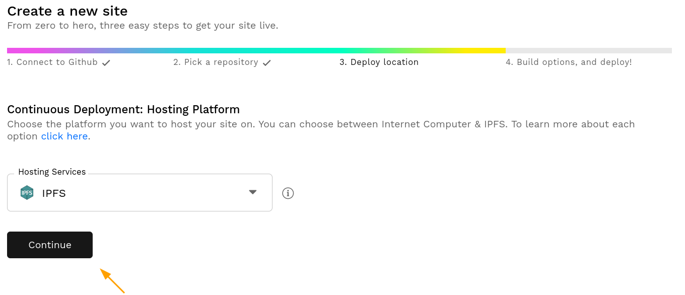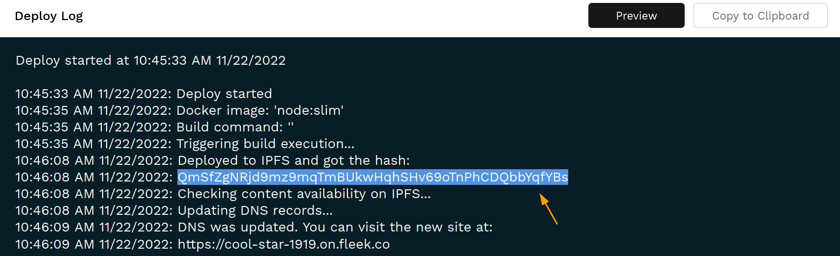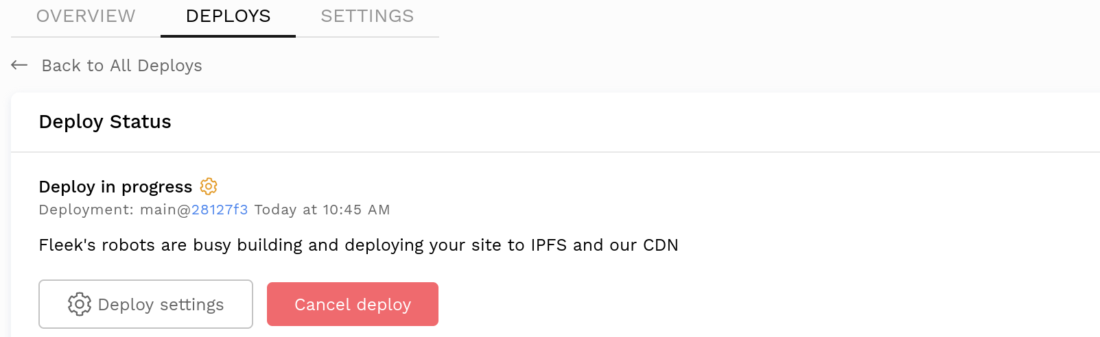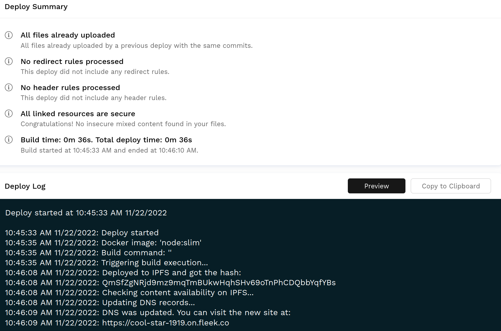 Fleek will now deploy the website to IPFS, which might take a little while.