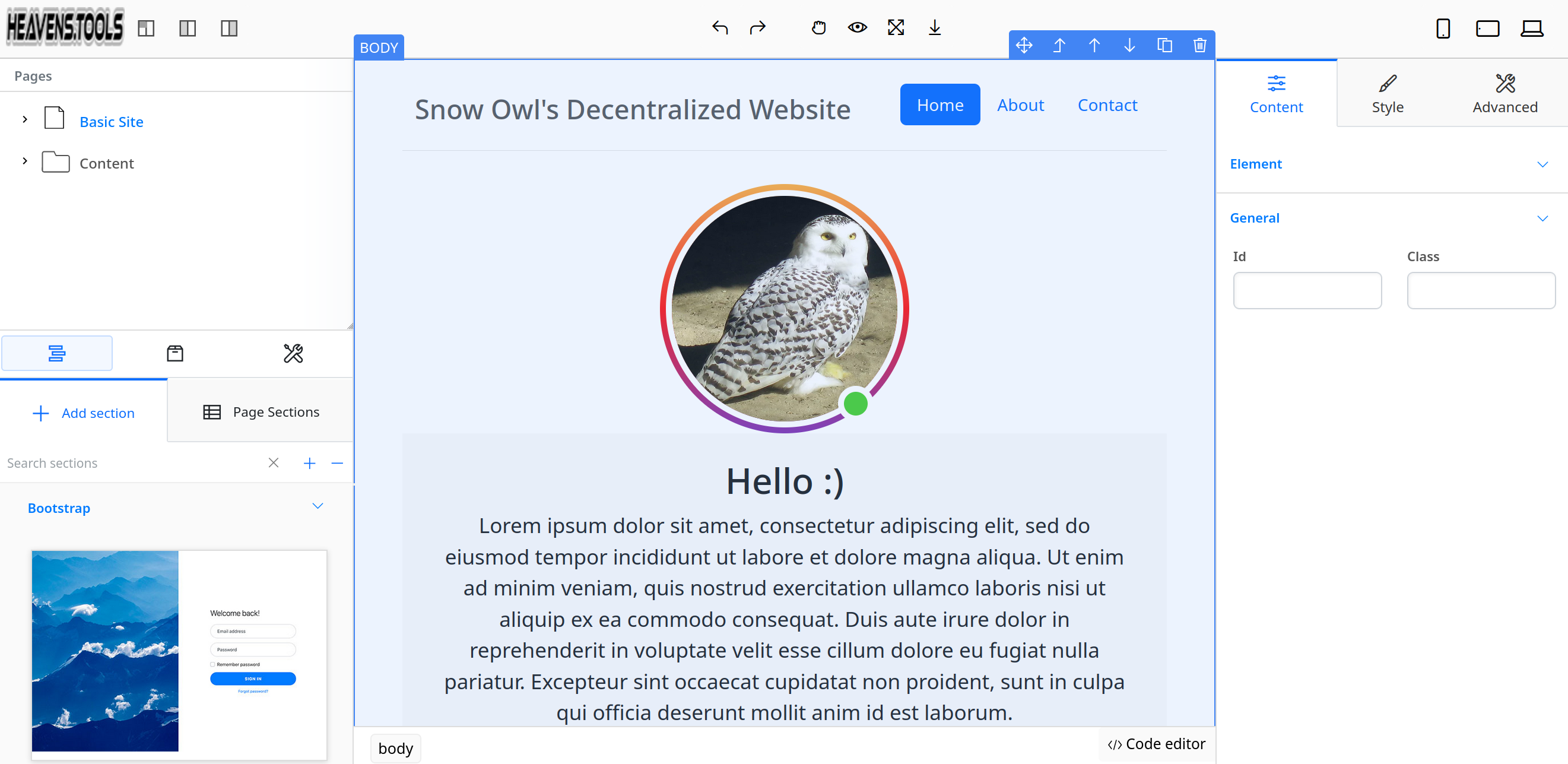 Before we can upload a site to IPFS we have to first create it! There are many ways to do that, but in this guide we'll try to keep it simple by using Heaven's Tools which is a WYSIWYG, or "What You See Is What You Get", type editor where you don't have to know how to code.