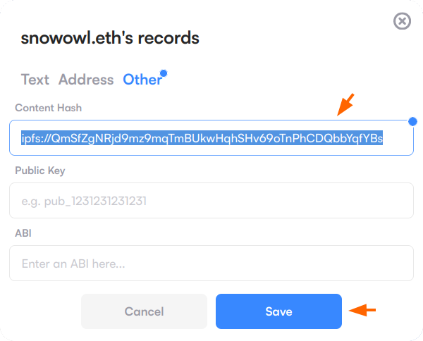 Type in the IPFS CID you saved earlier into the Content field and then click Save