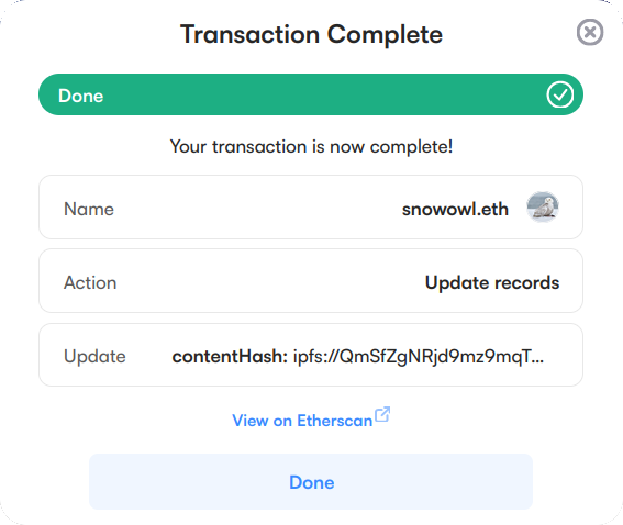 Once the transaction has completed you should see a screen like this, it means that the changes to the content record is now stored on-chain. Click Done to go back to the Manager.
