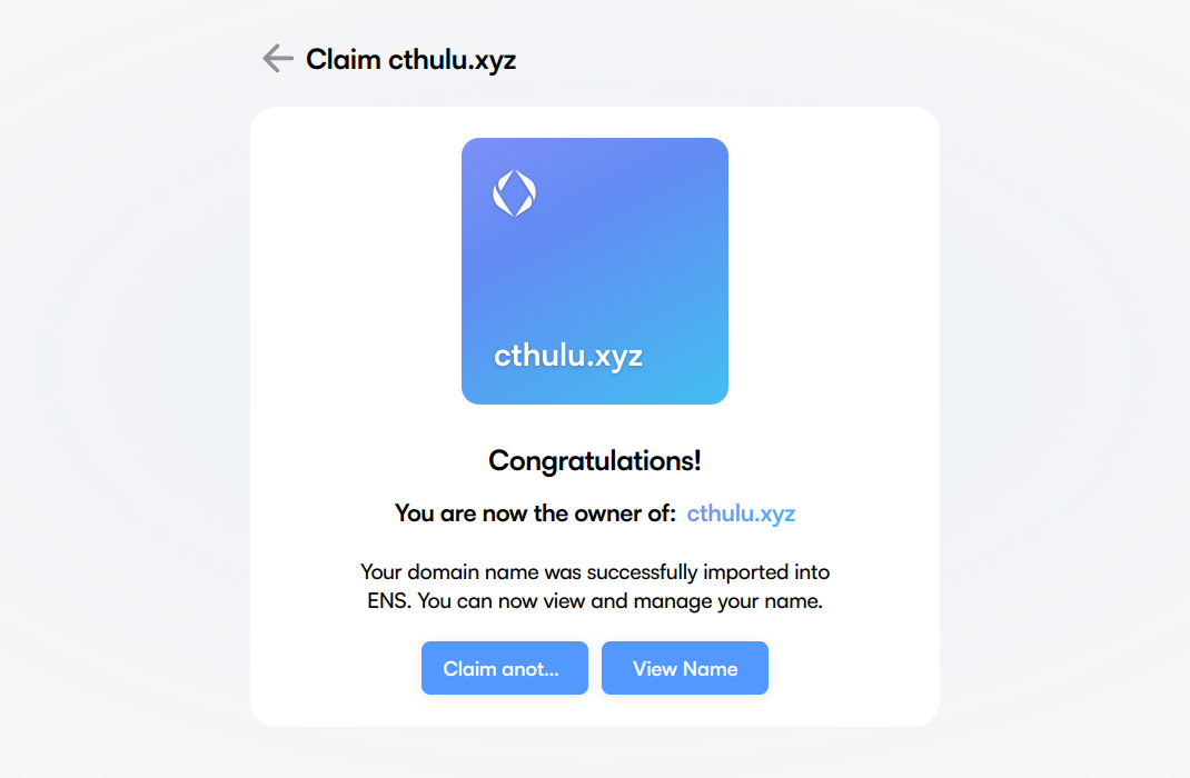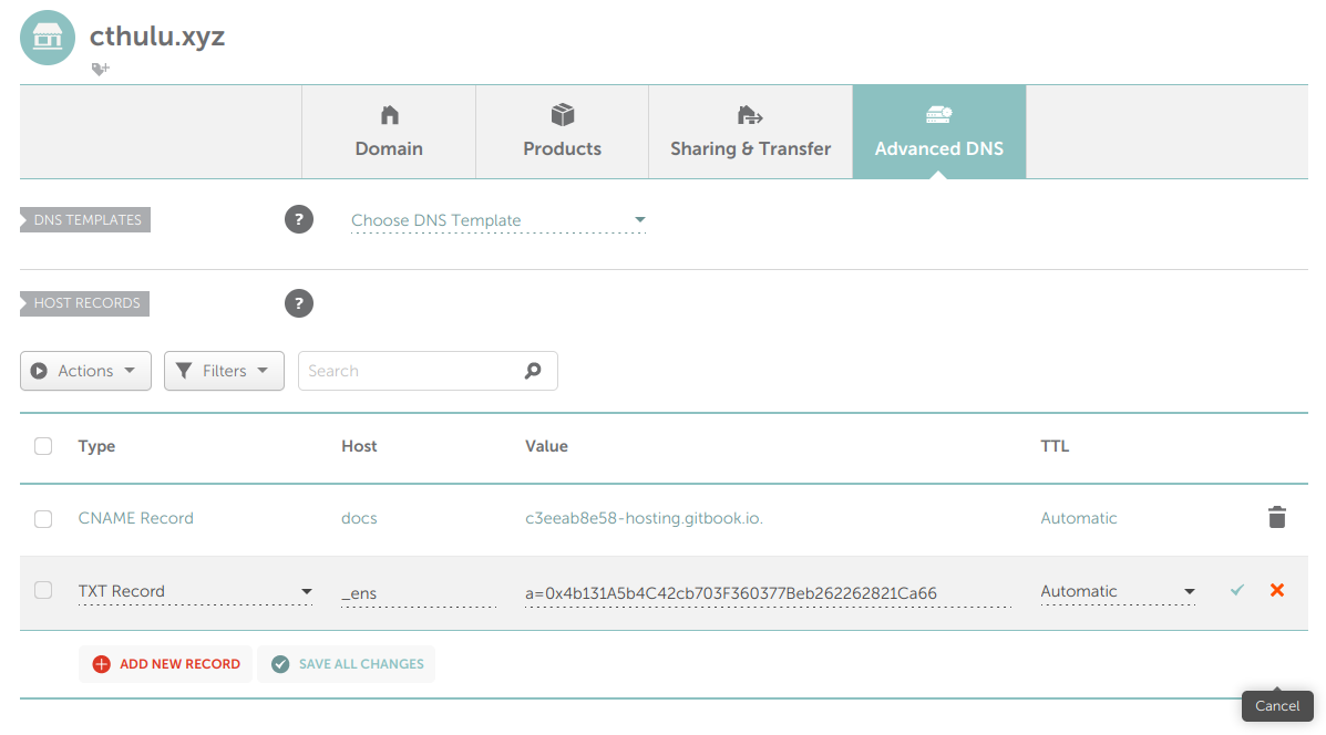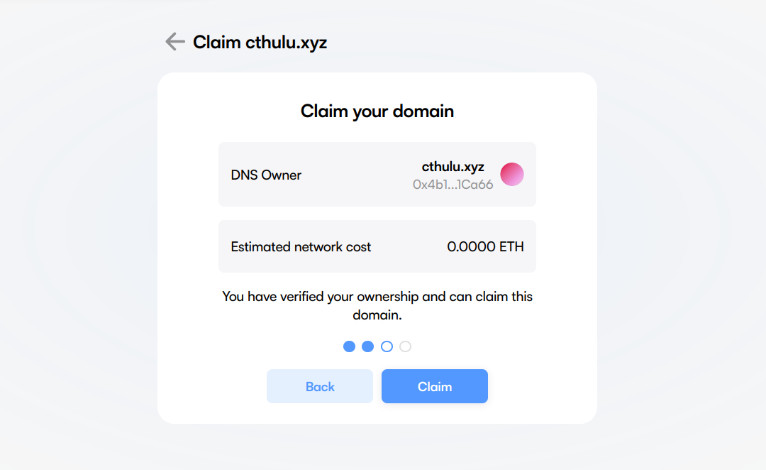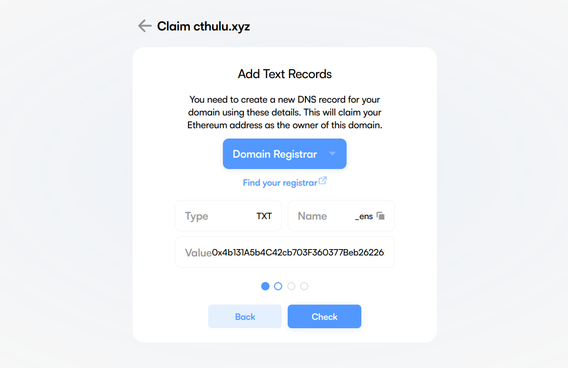 • An _ens TXT record must be created on the DNS name containing the wallet address to prove ownership of it.