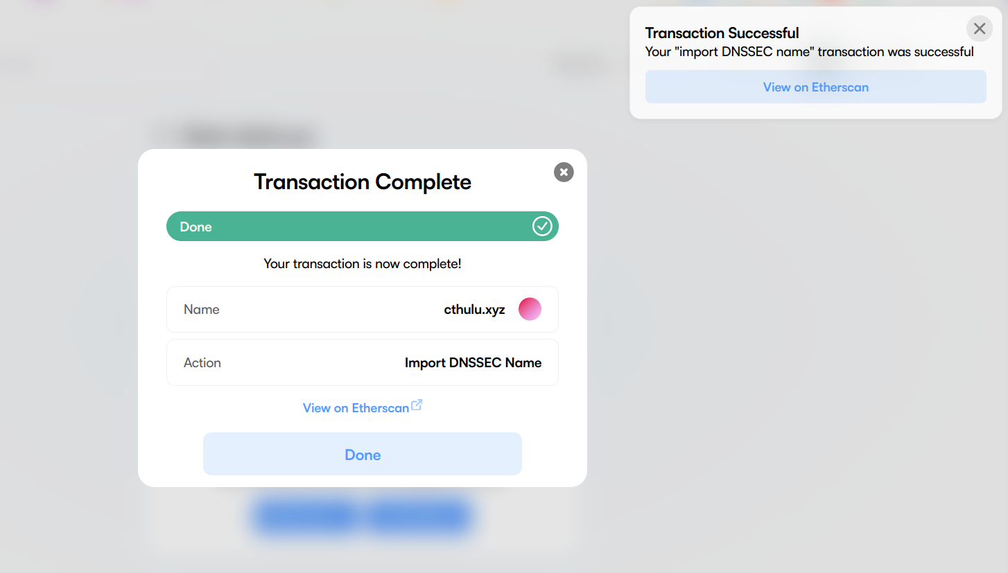 Now you should be able to go back to the ENS Manager App and finish linking the DNS name with ENS by pressing Register.