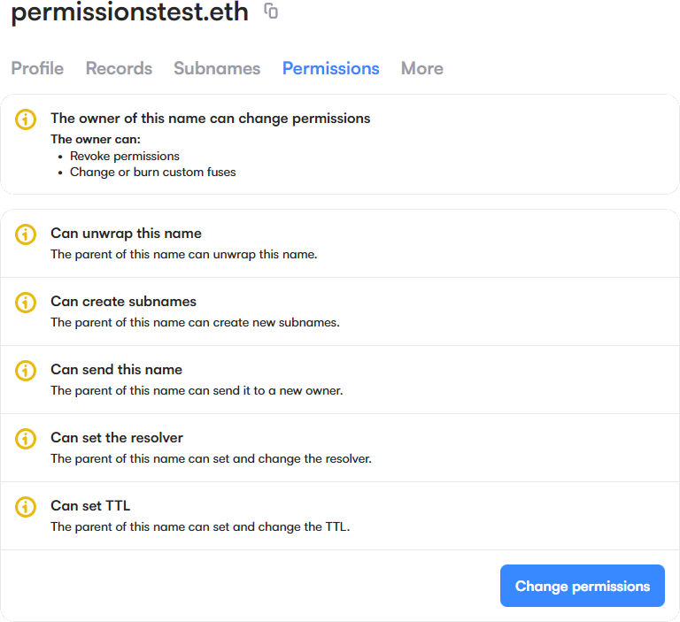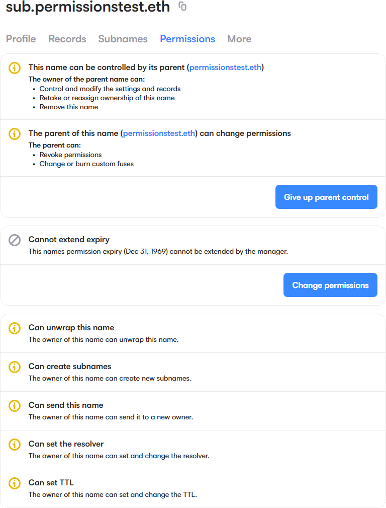 For example, if you want the owner of the subname to be able to extend their own expiry, then you can click on Change permissions and burn that fuse.