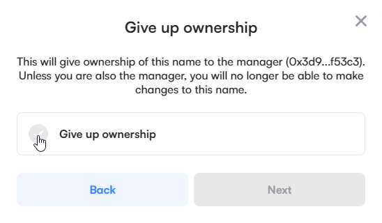 Click the "Give up ownership" button to select it, and then click Next to move to the next step: