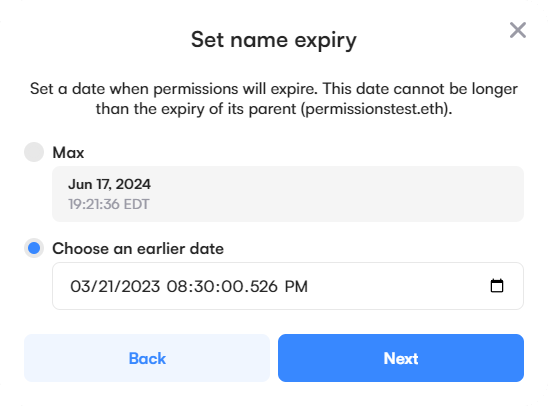 The maximum expiry you can set on a name is the expiry of the parent name. You can select Max to do this. Otherwise, you can select Choose an earlier date to set a different expiry.