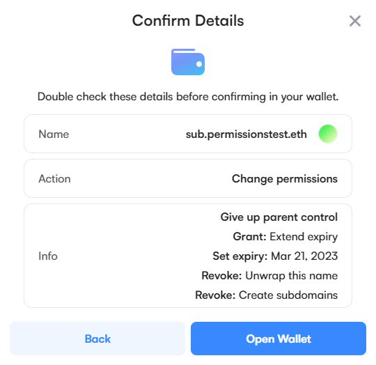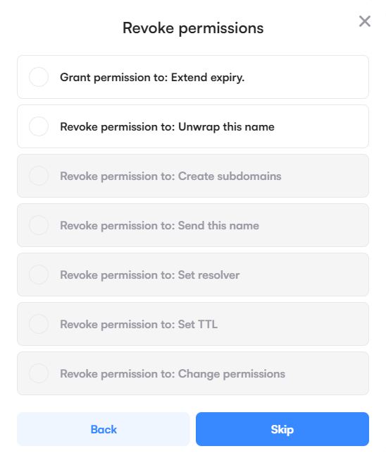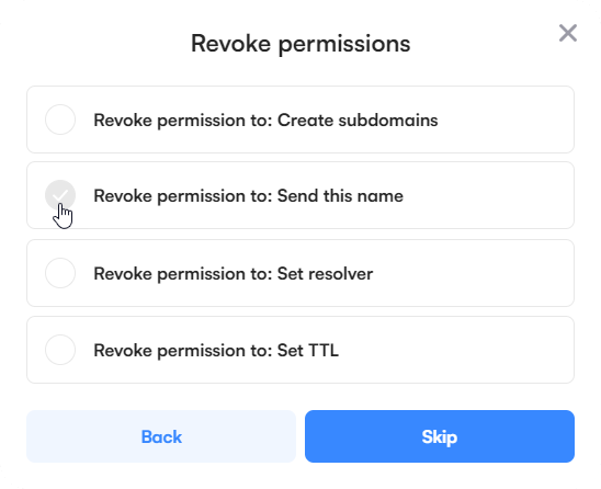 In this step, select which other permissions you want to change on the subname, if any. Note that once you give up control over this subname, you will no longer be able to change any permissions.