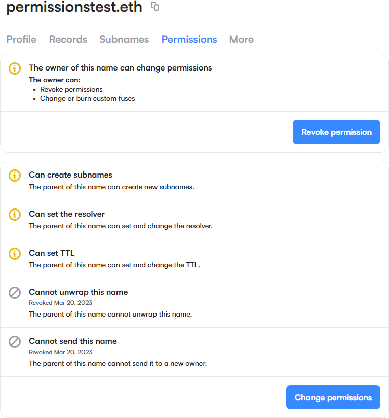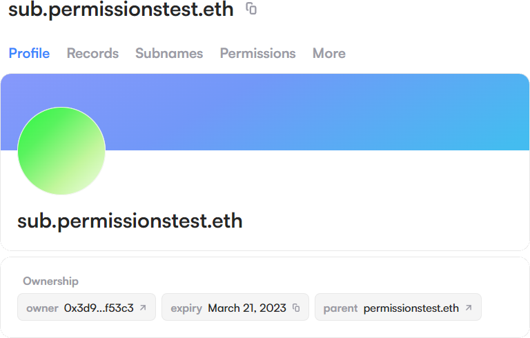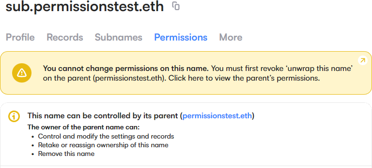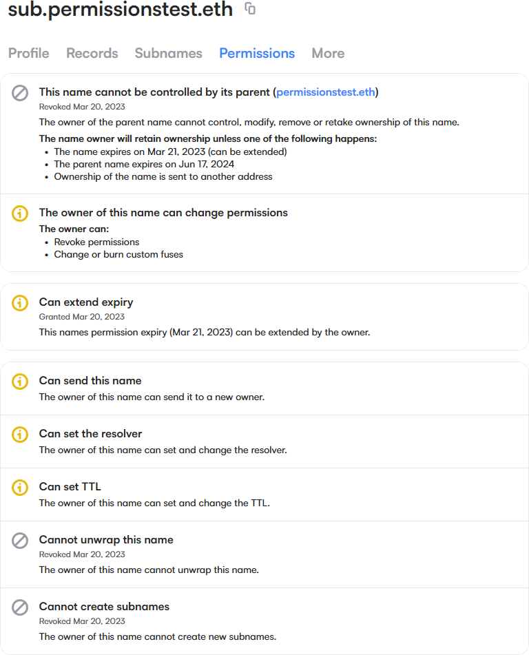 The Permissions tab for the subname will be updated to show which permissions you have revoked.