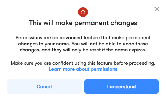 Revoking permissions is a one-way transaction that cannot be reversed (until the expiry is reached). Before changing any permissions on your name, please review these Name Wrapper sections to learn more:
