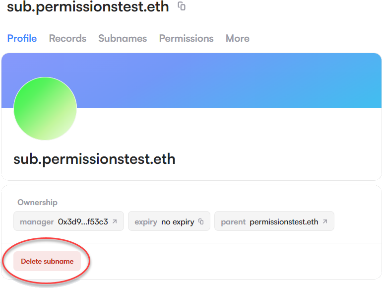 On the Profile tab for the subname, you'll also see that you no longer have the ability to delete the subname: