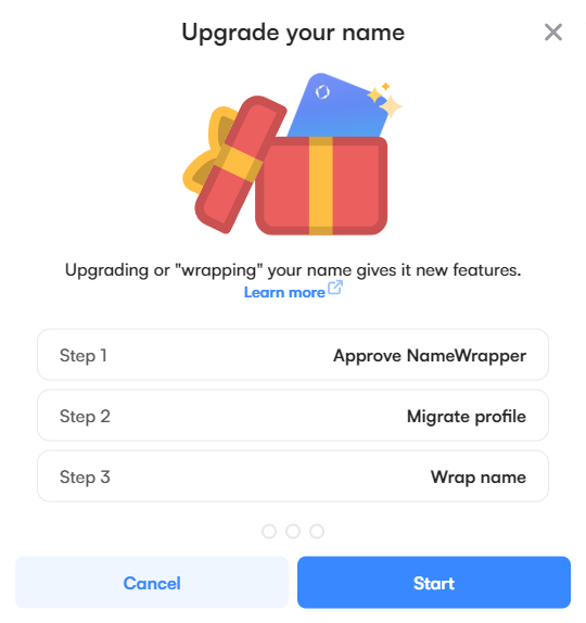 • The third "Wrap name" step will set the manager of your name to the Name Wrapper contract. You will be issued an ERC-1155 wrapped NFT in return.