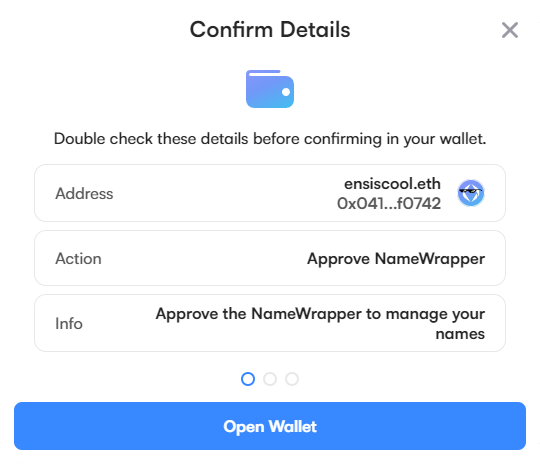 • The first "Approve NameWrapper" transaction will approve the Name Wrapper contract as an operator on the ENS registry for your account.
