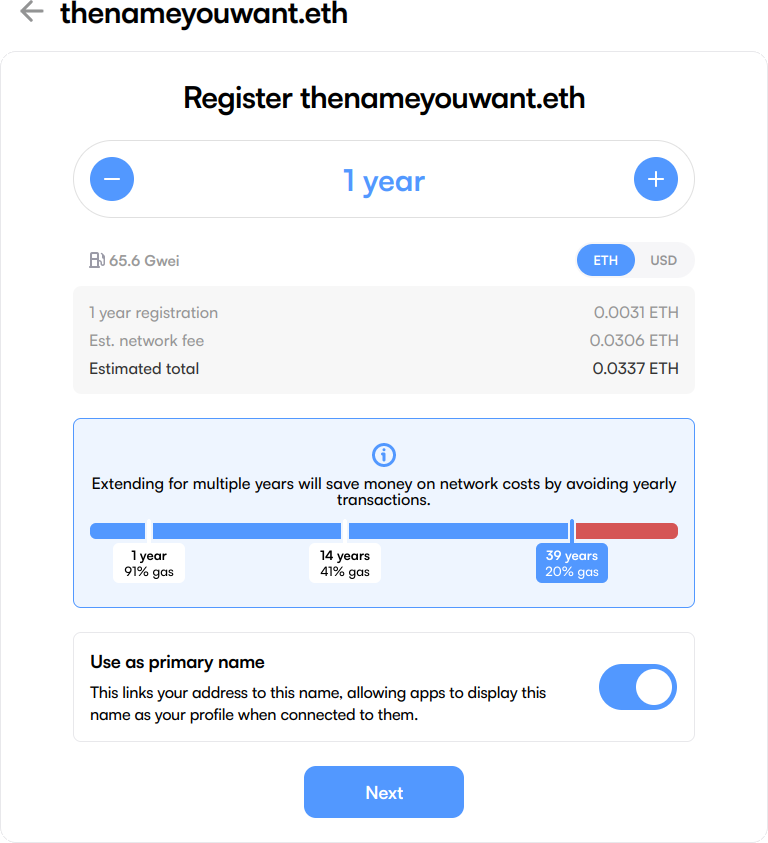 Select the amount of years you want to register the name for, and if you'd like to set it as your wallets Primary name during the registration process and then click Next