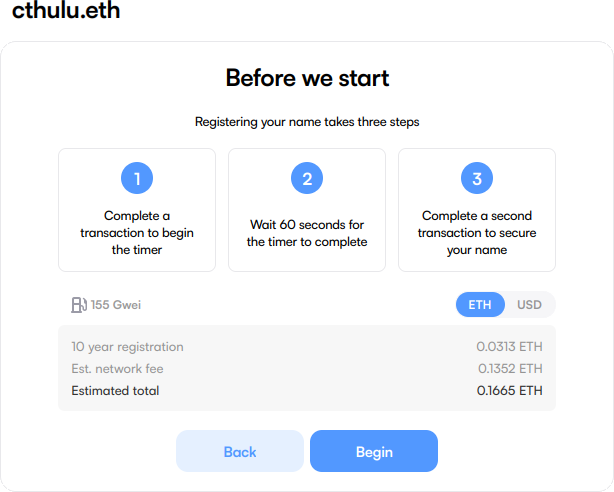 Double-check that the registration length and fees are satisfactory, then press Begin to start the registration process.