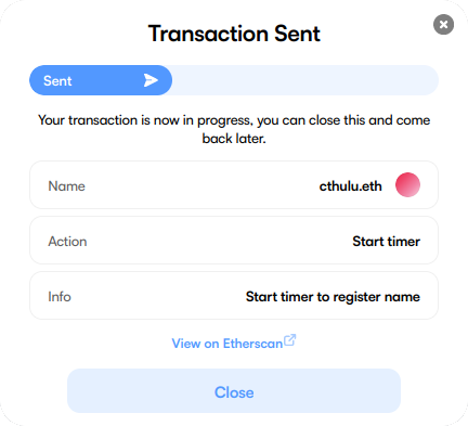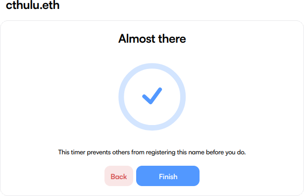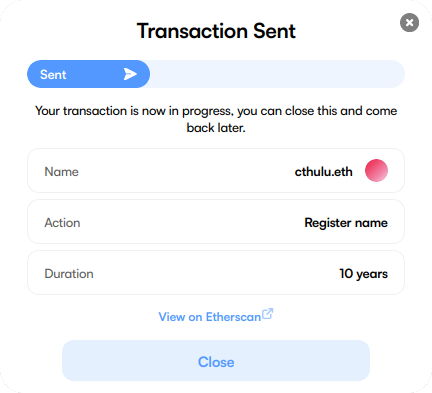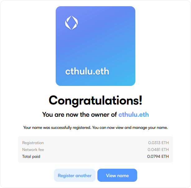 Congratulations! If all transactions went through successfully you should now be the proud owner of your very own ENS name!