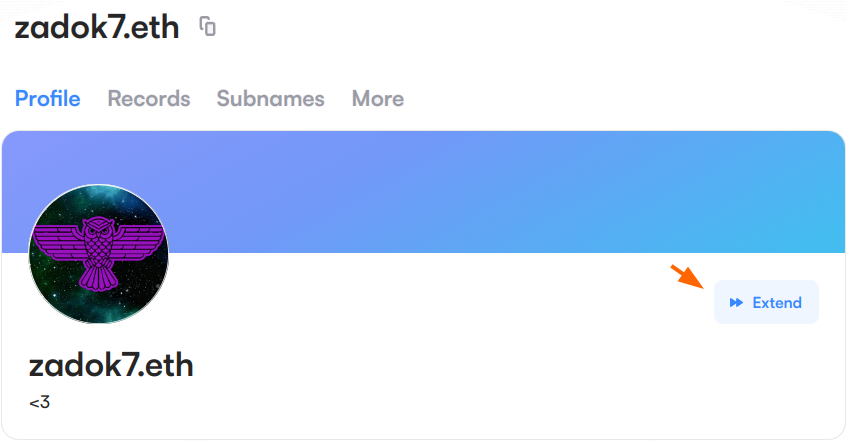 Go to the ENS Manager App and connect with your wallet. Search for the name you would like to renew and click on it to view its profile page. Click the Extend button.