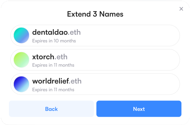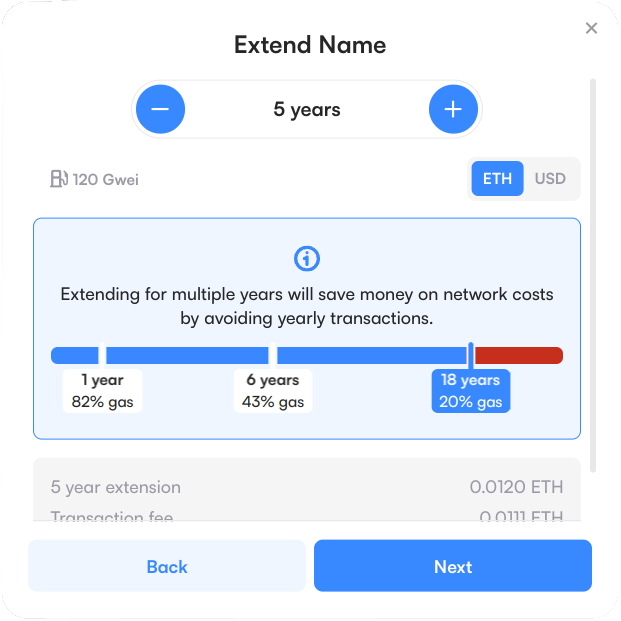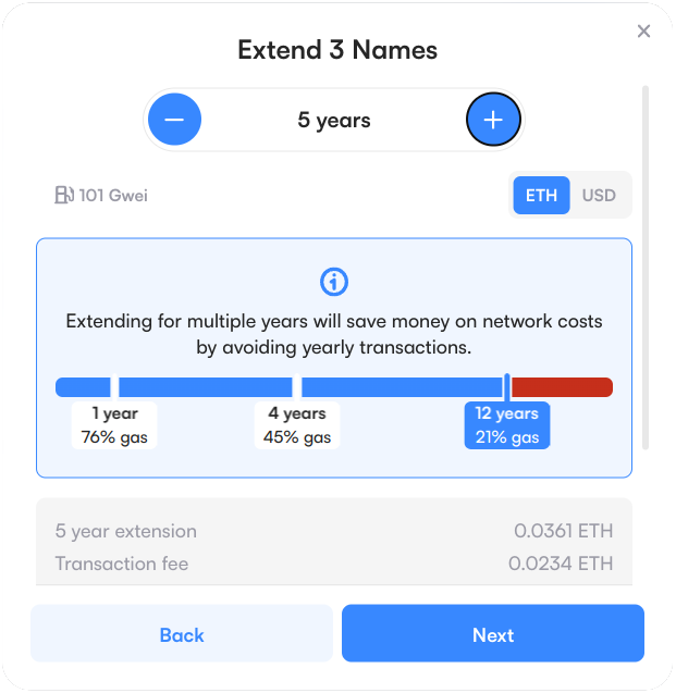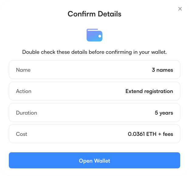 Pick the number of years you would like to extend the name’s registration. Click “Next”, then “Open Wallet” to confirm the transaction.