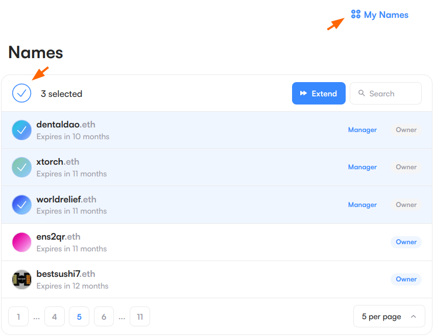 You can also renew multiple names at the same time. Click on “My Names”. Next, click on the multi-select checkmark button. Click on each name you would like to renew then click Extend