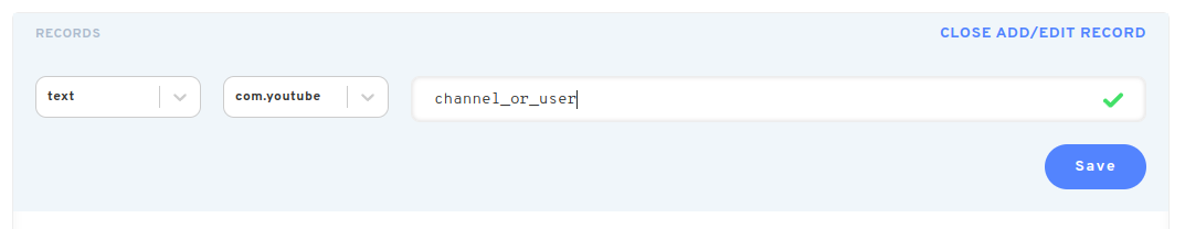 Next, input your YouTube.com username or channel and click “Save”. This will close the record editor, but there is still one more step!