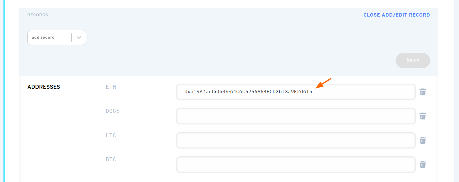 Enter the wallet address you want to point the ENS name to in the ETH record field.