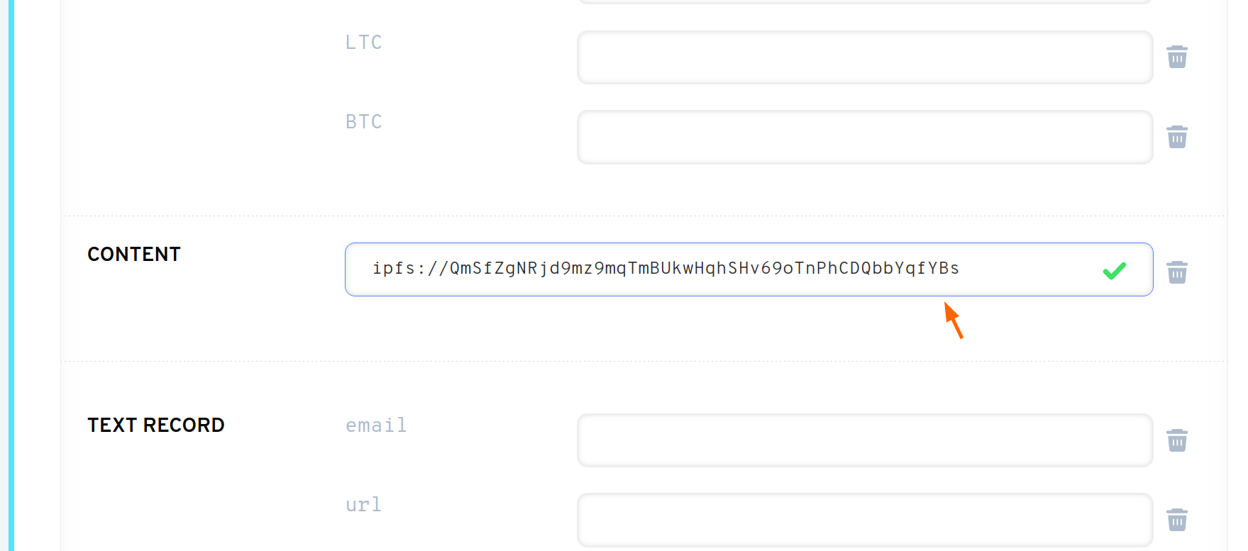 Go to your ENS name and click Add/Edit Record, scroll down and enter the IPFS CID you saved earlier into the Content field, then scroll down and click Save